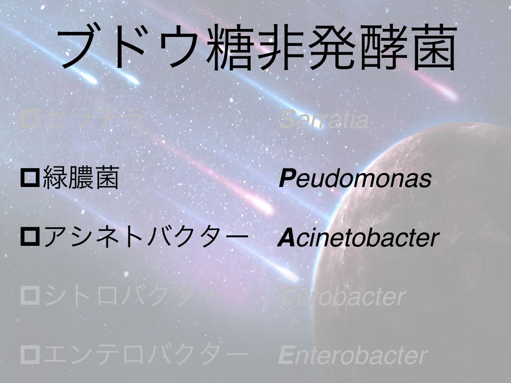 #25. ブドウ糖非発酵菌 pセラチラ Serratia p緑膿菌 Peudomonas pアシネトバクター Acinetobacter pシトロバクター Citrobacter pエンテロバクター Enterobacter