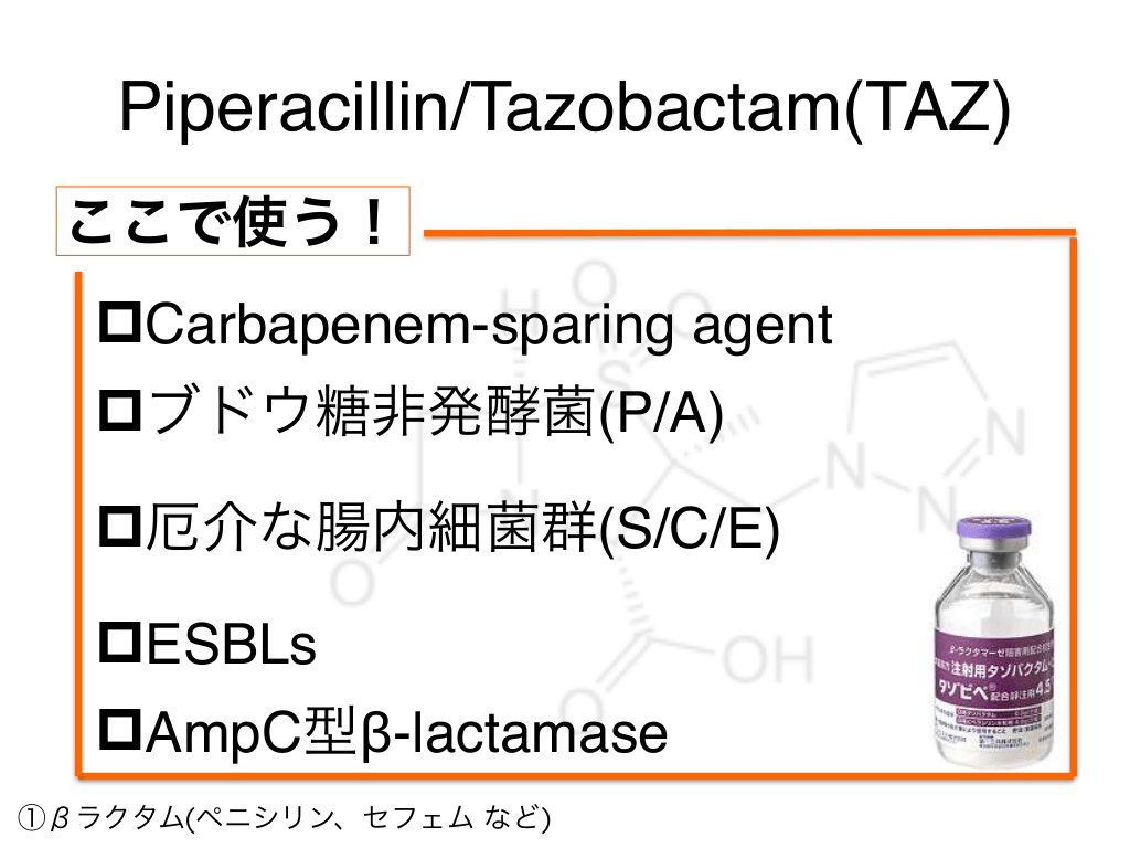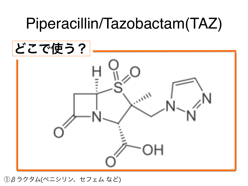 #27. Piperacillin/Tazobactam(TAZ) どこで使う? ①βラクタム(ペニシリン、セフェム など)