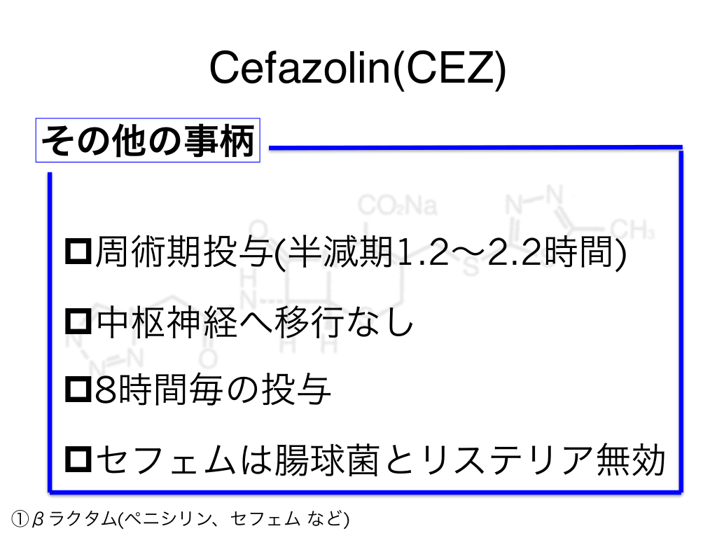 #33. Cefazolin(CEZ) その他の事柄 p周術期投与(半減期1.2〜2.2時間) p中枢神経へ移行なし p8時間毎の投与 pセフェムは腸球菌とリステリア無効 ①βラクタム(ペニシリン、セフェム など)
