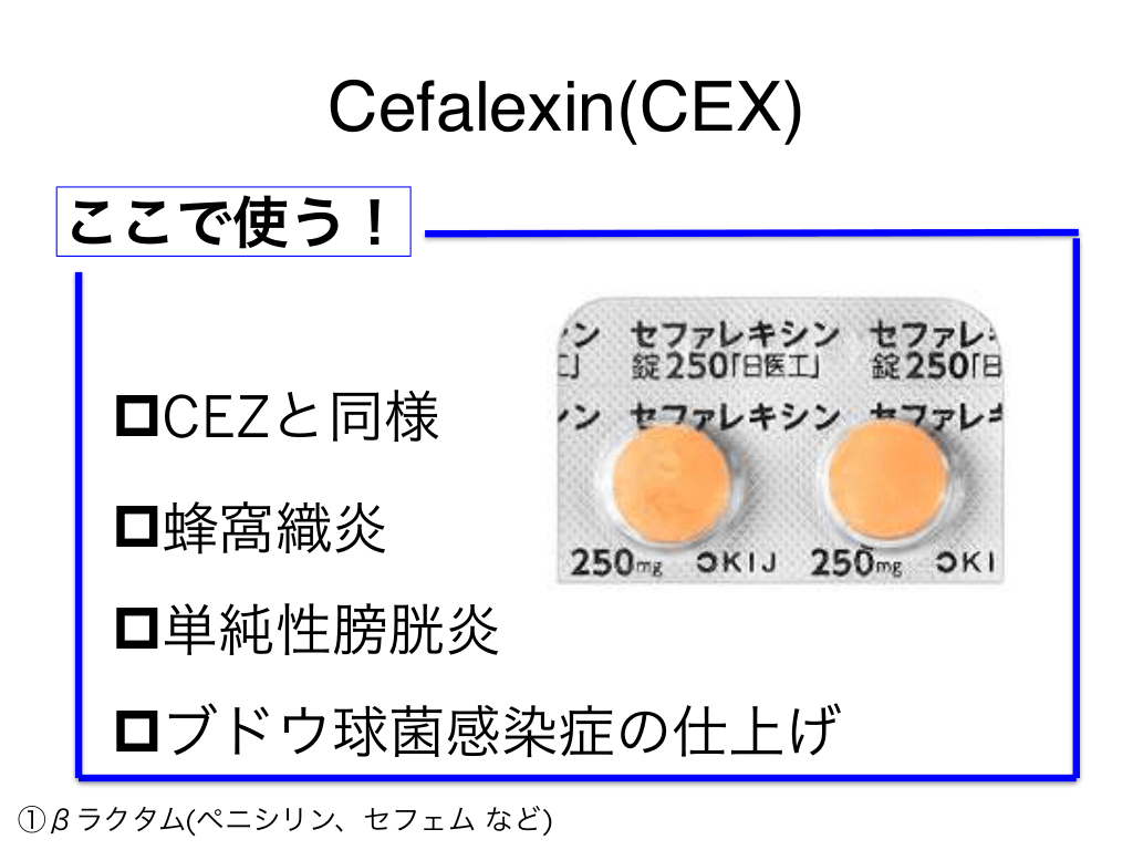 #34. Cefalexin(CEX) ここで使う! pCEZと同様 p蜂窩織炎 p単純性膀胱炎 pブドウ球菌感染症の仕上げ ①βラクタム(ペニシリン、セフェム など)