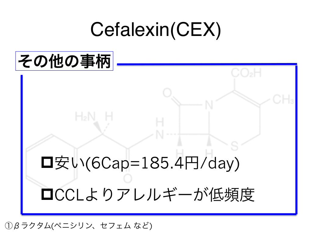 #35. Cefalexin(CEX) その他の事柄 p安い(6Cap=185.4円/day) pCCLよりアレルギーが低頻度 ①βラクタム(ペニシリン、セフェム など)