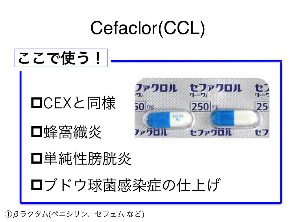 #36. Cefaclor(CCL) ここで使う! pCEXと同様 p蜂窩織炎 p単純性膀胱炎 pブドウ球菌感染症の仕上げ ①βラクタム(ペニシリン、セフェム など)