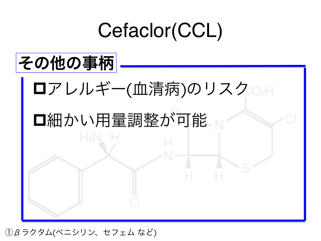 #37. Cefaclor(CCL) その他の事柄 pアレルギー(血清病)のリスク p細かい用量調整が可能 ①βラクタム(ペニシリン、セフェム など)