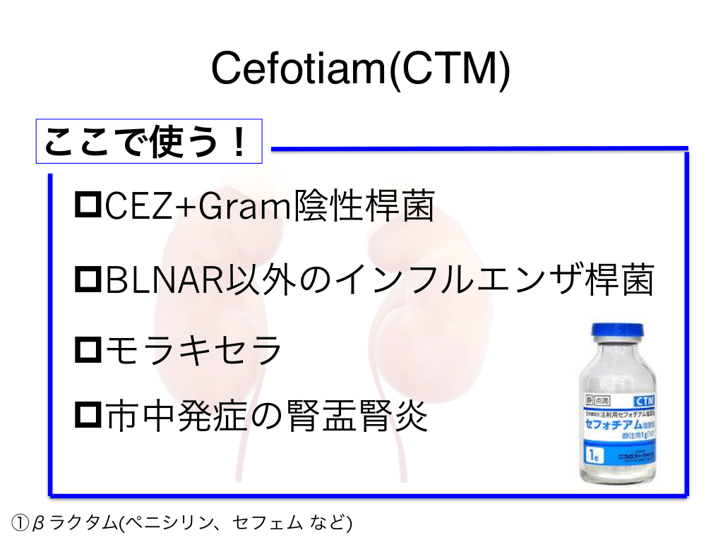 #39. Cefotiam(CTM) ここで使う! pCEZ+Gram陰性桿菌 pBLNAR以外のインフルエンザ桿菌 pモラキセラ p市中発症の腎盂腎炎 ①βラクタム(ペニシリン、セフェム など)
