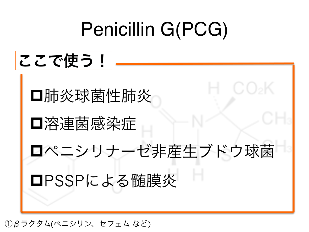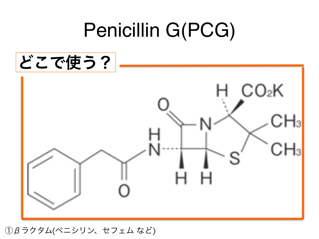 #4. Penicillin G(PCG) どこで使う? ①βラクタム(ペニシリン、セフェム など)