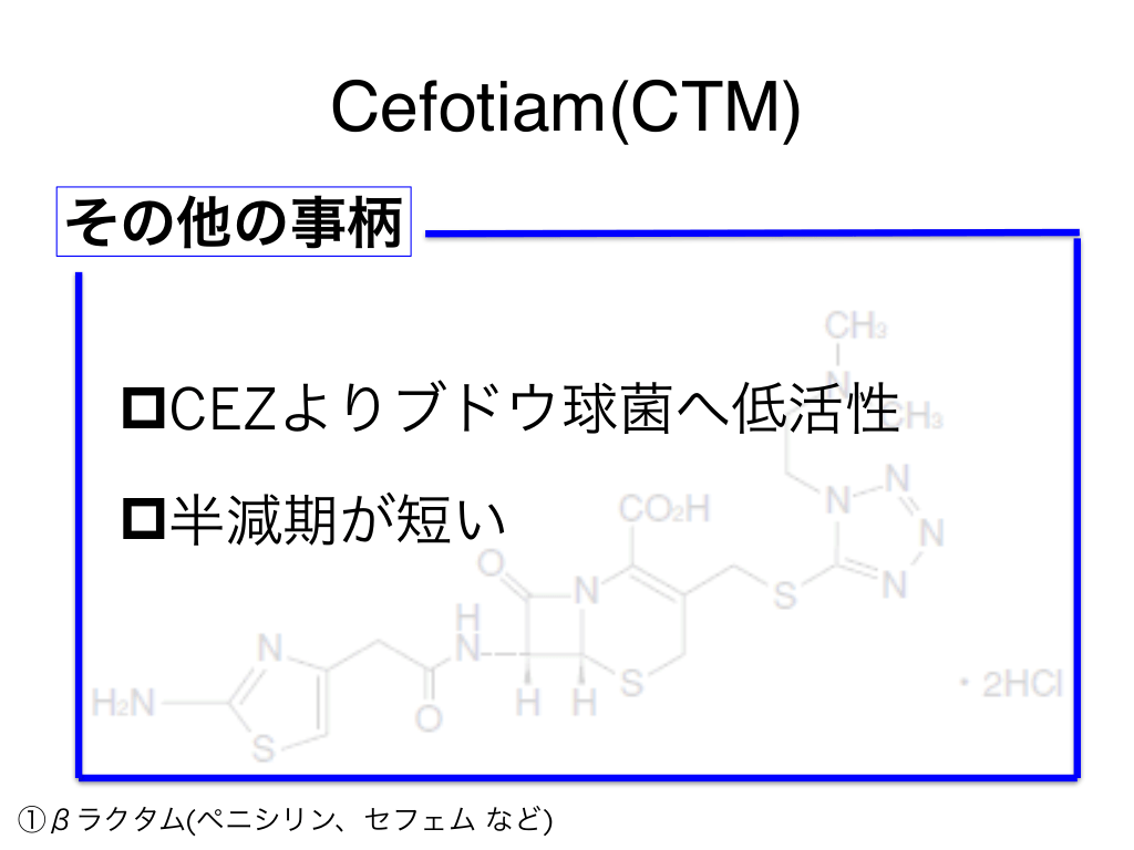 #40. Cefotiam(CTM) その他の事柄 pCEZよりブドウ球菌へ低活性 p半減期が短い ①βラクタム(ペニシリン、セフェム など)