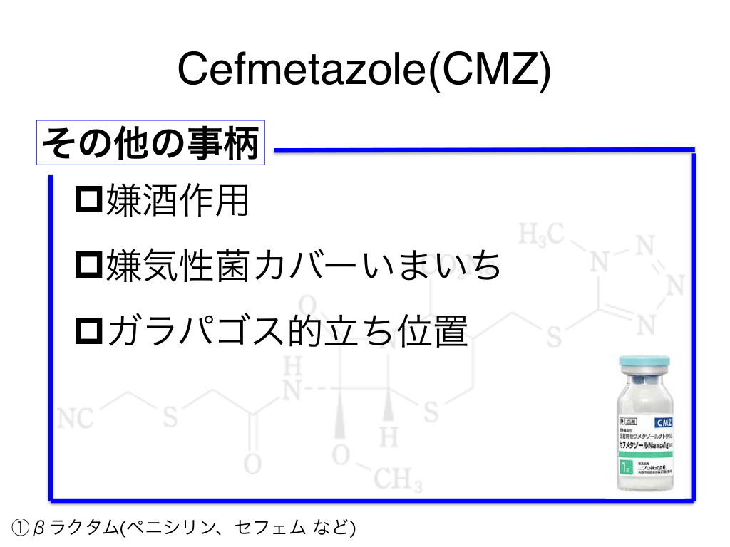 #43. Cefmetazole(CMZ) その他の事柄 p嫌酒作用 p嫌気性菌カバーいまいち pガラパゴス的立ち位置 ①βラクタム(ペニシリン、セフェム など)