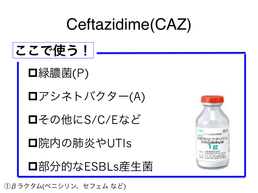#50. Ceftazidime(CAZ) ここで使う! p緑膿菌(P) pアシネトバクター(A) pその他にS/C/Eなど p院内の肺炎やUTIs p部分的なESBLs産生菌 ①βラクタム(ペニシリン、セフェム など)