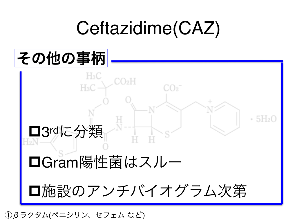 #51. Ceftazidime(CAZ) その他の事柄 p3rdに分類 pGram陽性菌はスルー p施設のアンチバイオグラム次第 ①βラクタム(ペニシリン、セフェム など)