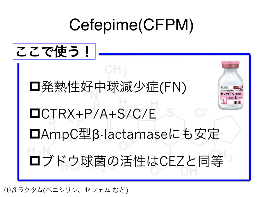 #53. Cefepime(CFPM) ここで使う! p発熱性好中球減少症(FN) pCTRX+P/A+S/C/E pAmpC型β-lactamaseにも安定 pブドウ球菌の活性はCEZと同等 ①βラクタム(ペニシリン、セフェム など)