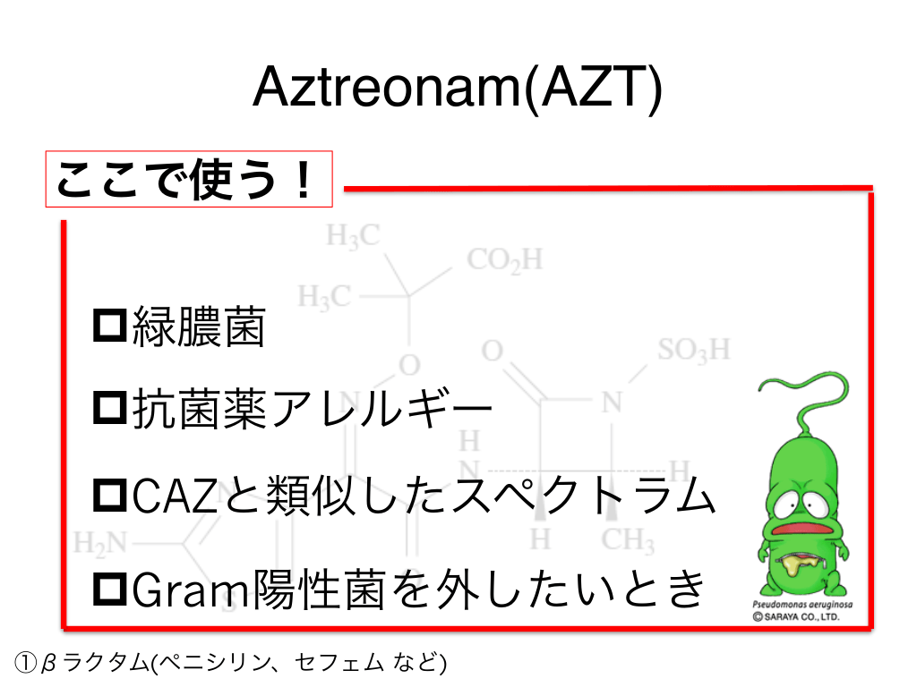 #55. Aztreonam(AZT) ここで使う! p緑膿菌 p抗菌薬アレルギー pCAZと類似したスペクトラム pGram陽性菌を外したいとき ①βラクタム(ペニシリン、セフェム など)