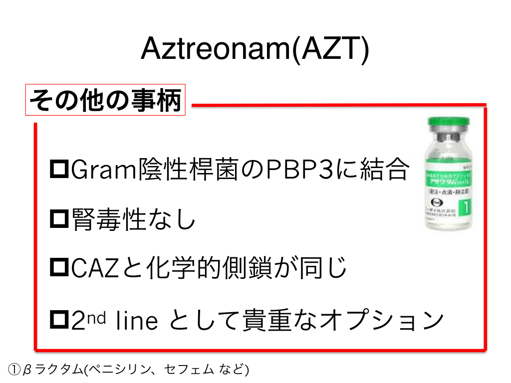 #56. Aztreonam(AZT) その他の事柄 pGram陰性桿菌のPBP3に結合 p腎毒性なし pCAZと化学的側鎖が同じ p2nd line として貴重なオプション ①βラクタム(ペニシリン、セフェム など)