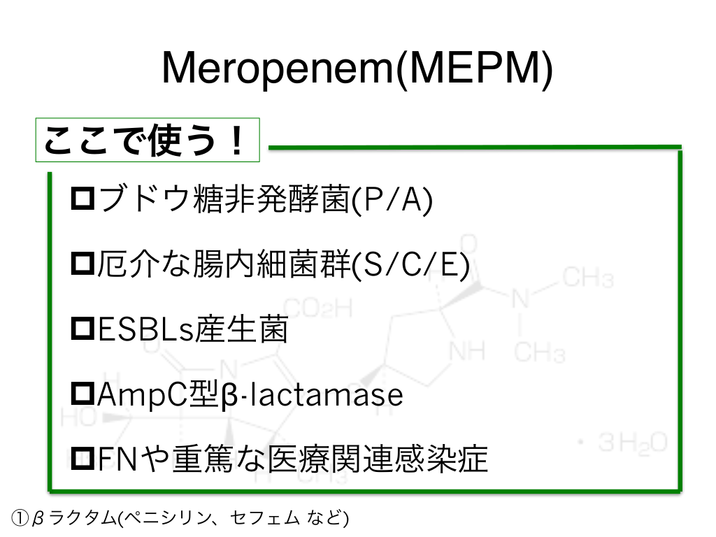 #58. Meropenem(MEPM) ここで使う! pブドウ糖非発酵菌(P/A) p厄介な腸内細菌群(S/C/E) pESBLs産生菌 pAmpC型β-lactamase pFNや重篤な医療関連感染症 ①βラクタム(ペニシリン、セフェム など)