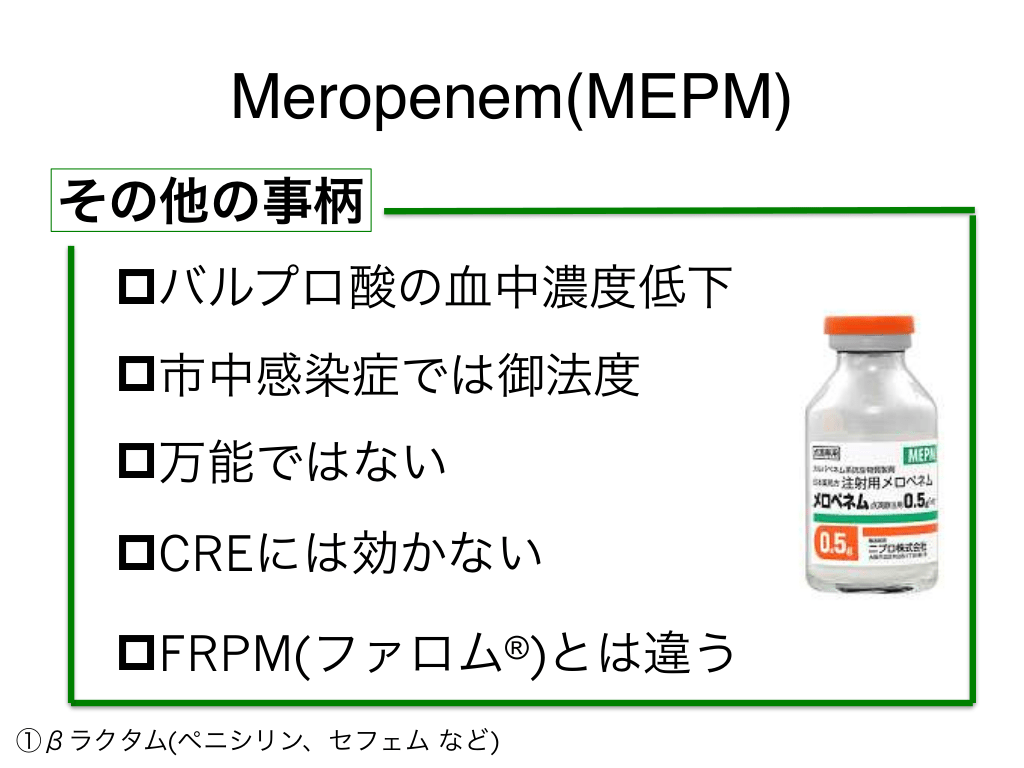 #59. Meropenem(MEPM) その他の事柄 pバルプロ酸の血中濃度低下 p市中感染症では御法度 p万能ではない pCREには効かない pFRPM(ファロム )とは違う ®︎ ①βラクタム(ペニシリン、セフェム など)