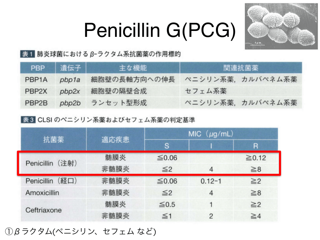 #5. Penicillin G(PCG) ここで使う! p肺炎球菌性肺炎 p溶連菌感染症 pペニシリナーゼ非産生ブドウ球菌 pPSSPによる髄膜炎 ①βラクタム(ペニシリン、セフェム など)