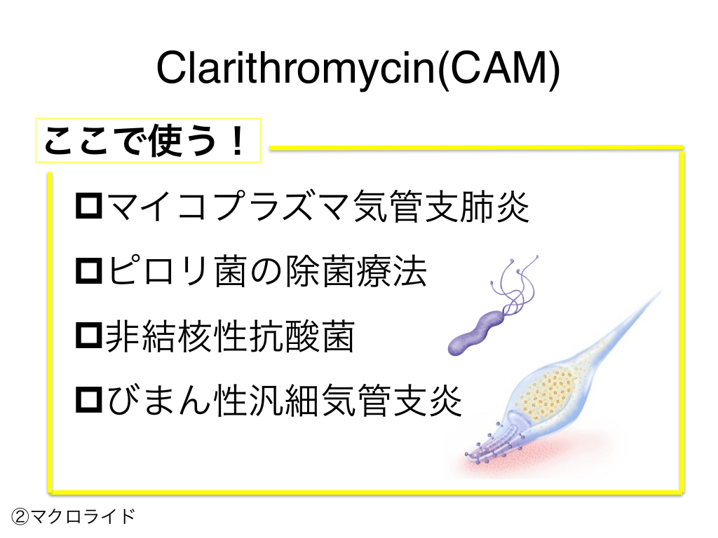 #62. Clarithromycin(CAM) ここで使う! pマイコプラズマ気管支肺炎 pピロリ菌の除菌療法 p非結核性抗酸菌 pびまん性汎細気管支炎 ②マクロライド