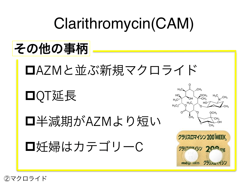 #63. Clarithromycin(CAM) その他の事柄 pAZMと並ぶ新規マクロライド pQT延長 p半減期がAZMより短い p妊婦はカテゴリーC ②マクロライド