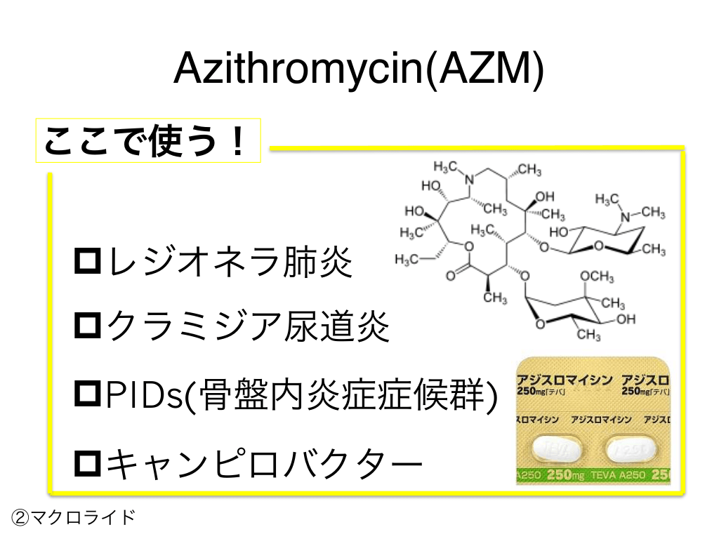 #64. Azithromycin(AZM) ここで使う! pレジオネラ肺炎 pクラミジア尿道炎 pPIDs(骨盤内炎症症候群) pキャンピロバクター ②マクロライド