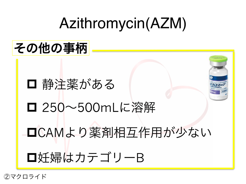#65. Azithromycin(AZM) その他の事柄 p 静注薬がある p 250〜500mLに溶解 pCAMより薬剤相互作用が少ない p妊婦はカテゴリーB ②マクロライド