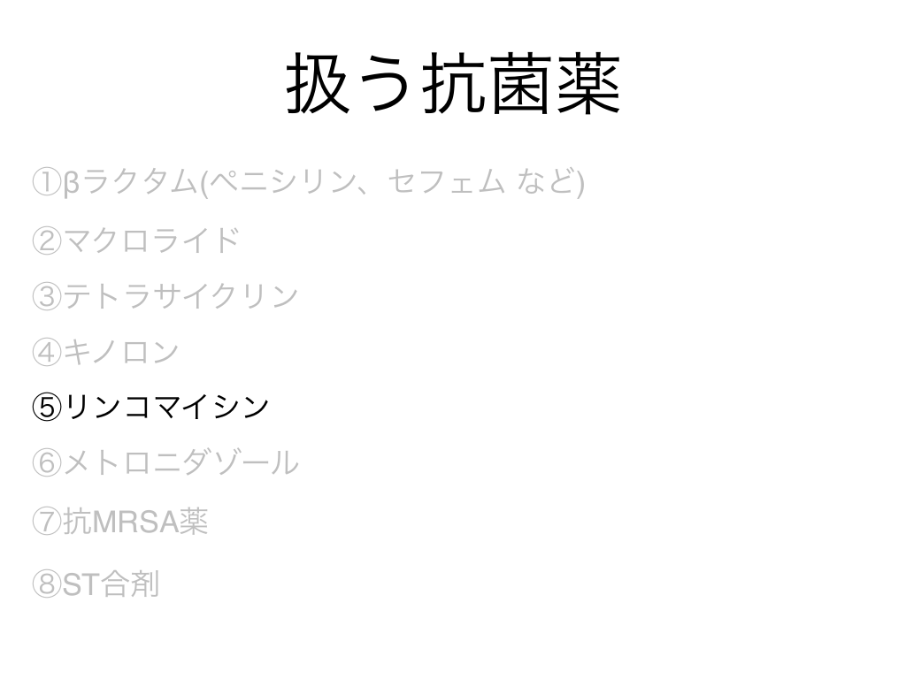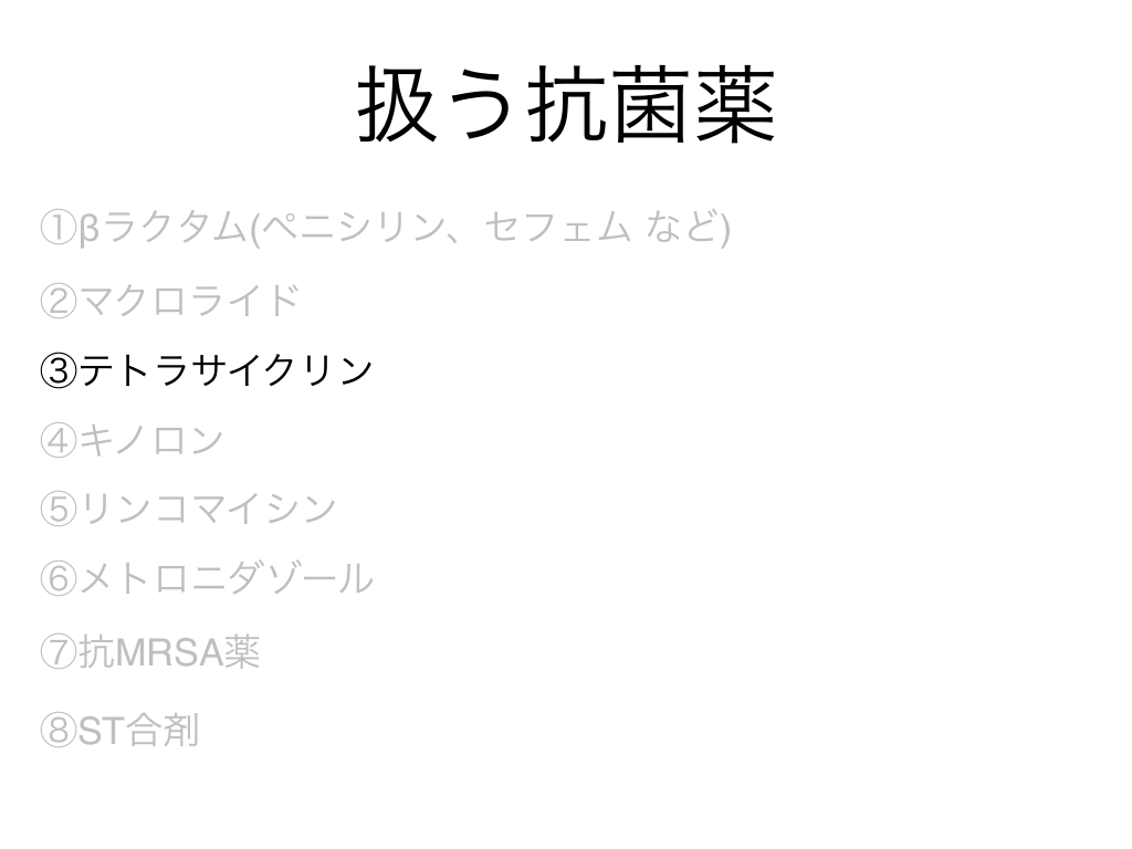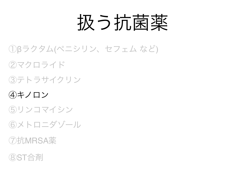 #3. 扱う抗菌薬 ①βラクタム(ペニシリン、セフェム など) ②マクロライド ③テトラサイクリン ④キノロン ⑤リンコマイシン ⑥メトロニダゾール ⑦抗MRSA薬 ⑧ST合剤