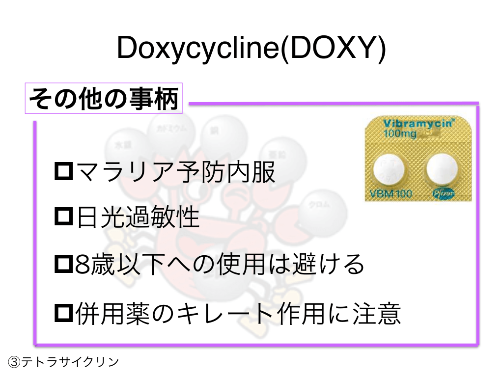 #69. Doxycycline(DOXY) その他の事柄 pマラリア予防内服 p日光過敏性 p8歳以下への使用は避ける p併用薬のキレート作用に注意 ③テトラサイクリン