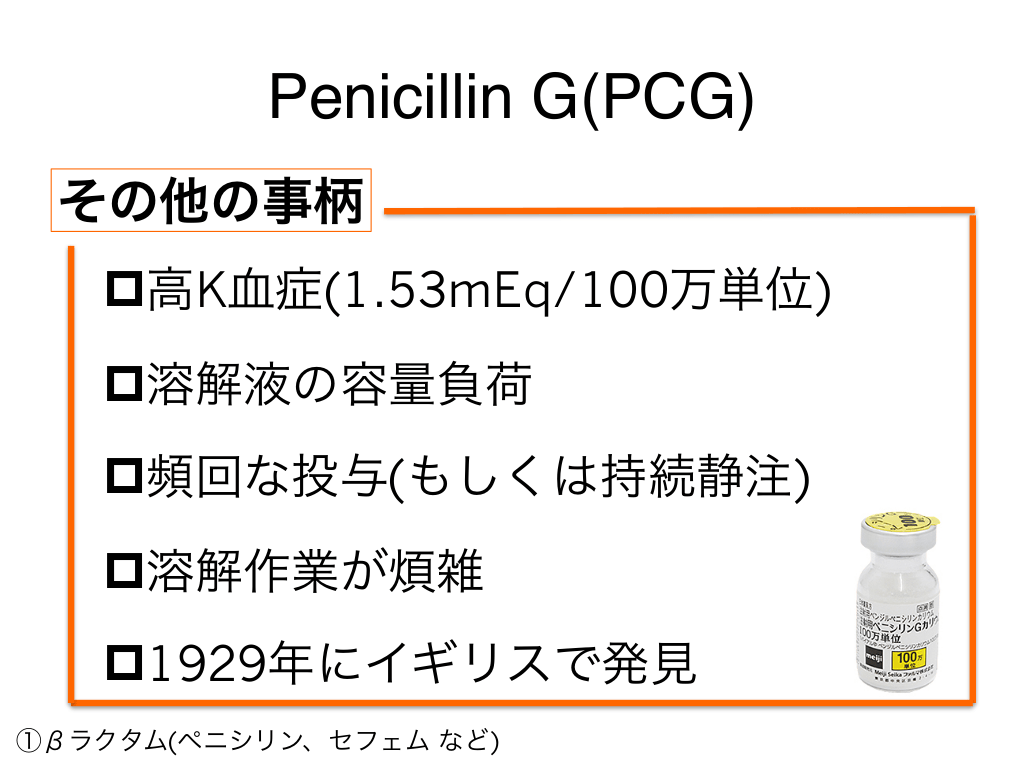 #7. Penicillin G(PCG) その他の事柄 p高K血症(1.53mEq/100万単位) p溶解液の容量負荷 p頻回な投与(もしくは持続静注) p溶解作業が煩雑 p1929年にイギリスで発見 ①βラクタム(ペニシリン、セフェム など)