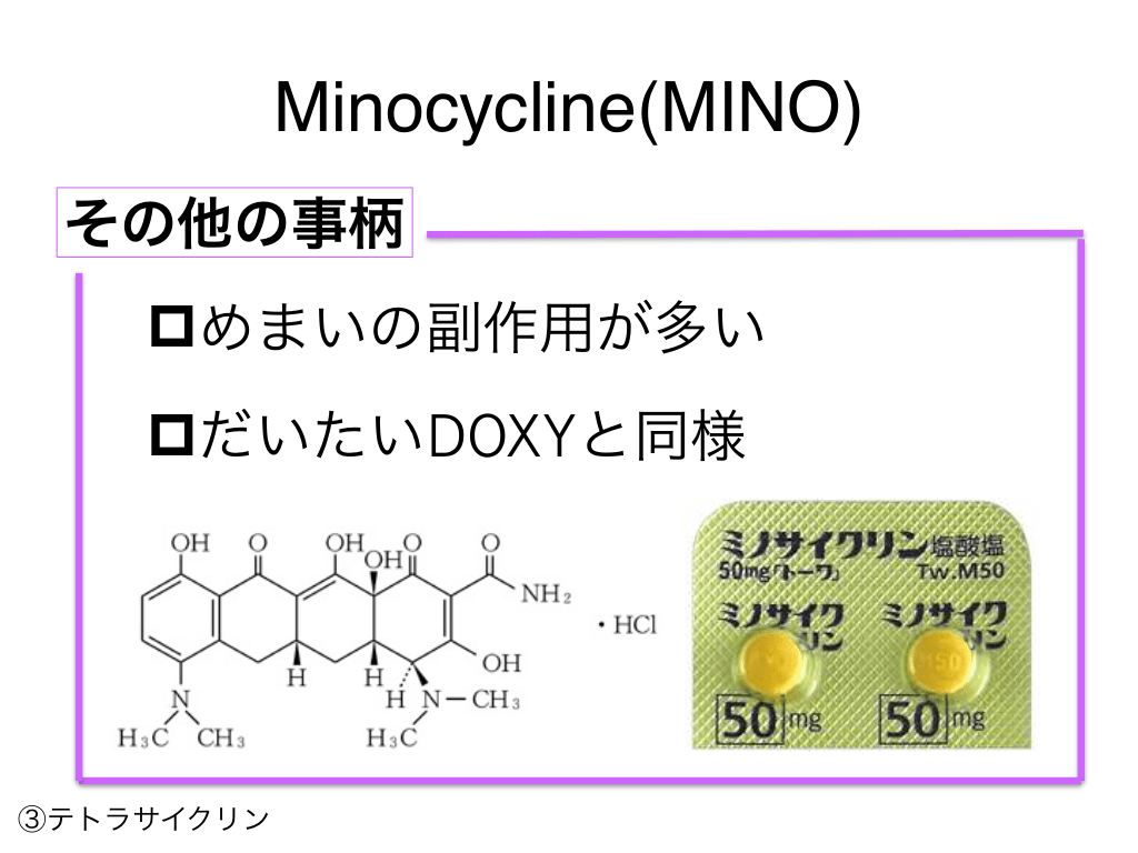 #71. Minocycline(MINO) その他の事柄 pめまいの副作用が多い pだいたいDOXYと同様 ③テトラサイクリン