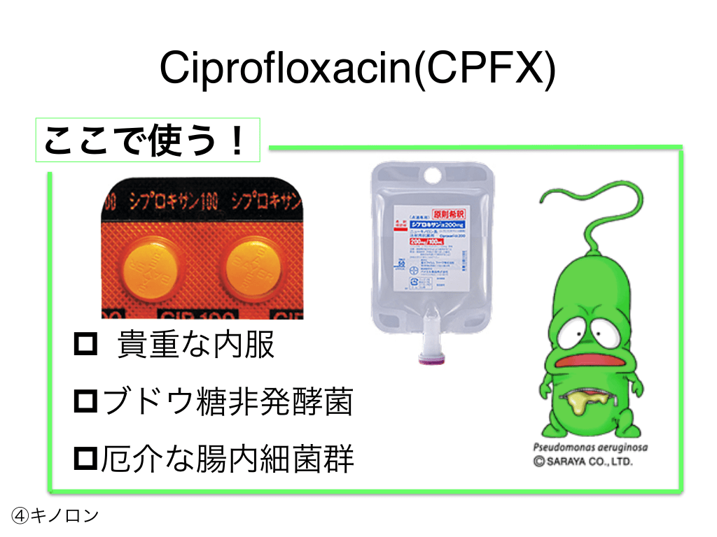 #74. Ciprofloxacin(CPFX) ここで使う! p 貴重な内服 pブドウ糖非発酵菌 p厄介な腸内細菌群 ④キノロン