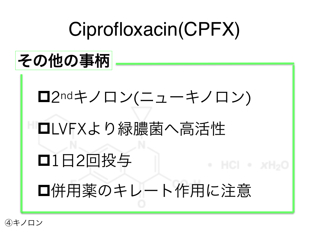 #75. Ciprofloxacin(CPFX) その他の事柄 p2ndキノロン(ニューキノロン) pLVFXより緑膿菌へ高活性 p1日2回投与 p併用薬のキレート作用に注意 ④キノロン