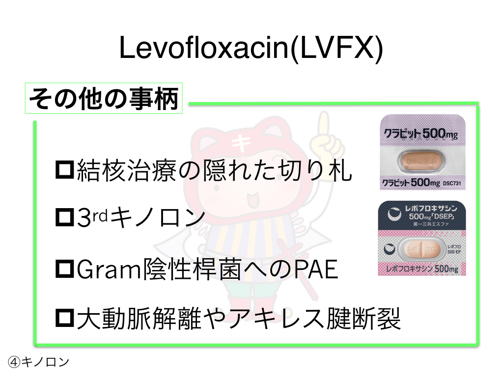 #77. Levofloxacin(LVFX) その他の事柄 p結核治療の隠れた切り札 p3rdキノロン pGram陰性桿菌へのPAE p大動脈解離やアキレス腱断裂 ④キノロン