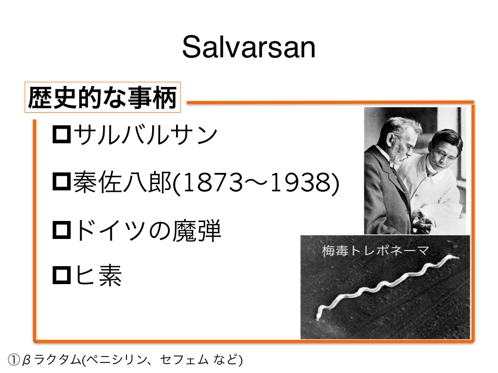 #8. Salvarsan 歴史的な事柄 pサルバルサン p秦佐八郎(1873〜1938) pドイツの魔弾 pヒ素 ①βラクタム(ペニシリン、セフェム など)