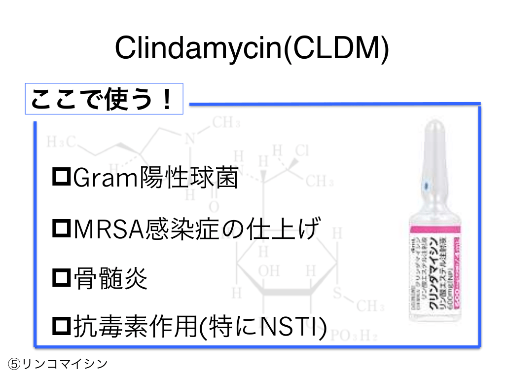#80. Clindamycin(CLDM) ここで使う! pGram陽性球菌 pMRSA感染症の仕上げ p骨髄炎 p抗毒素作用(特にNSTI) ⑤リンコマイシン