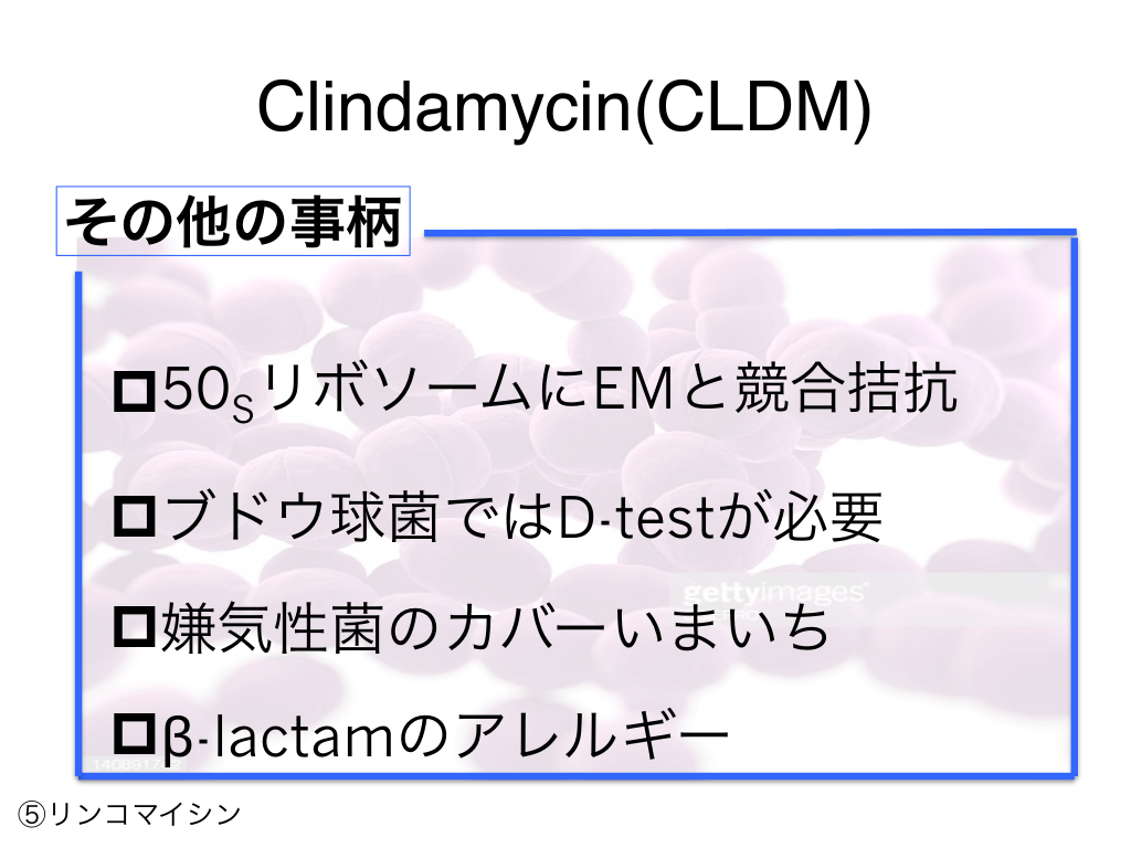 #81. Clindamycin(CLDM) その他の事柄 p50SリボソームにEMと競合拮抗 pブドウ球菌ではD-testが必要 p嫌気性菌のカバーいまいち pβ-lactamのアレルギー ⑤リンコマイシン