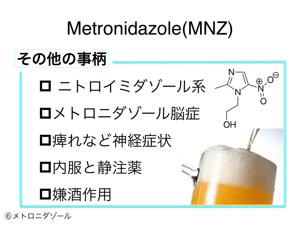 #85. Metronidazole(MNZ) その他の事柄 p ニトロイミダゾール系 pメトロニダゾール脳症 p痺れなど神経症状 p内服と静注薬 p嫌酒作用 ⑥メトロニダゾール