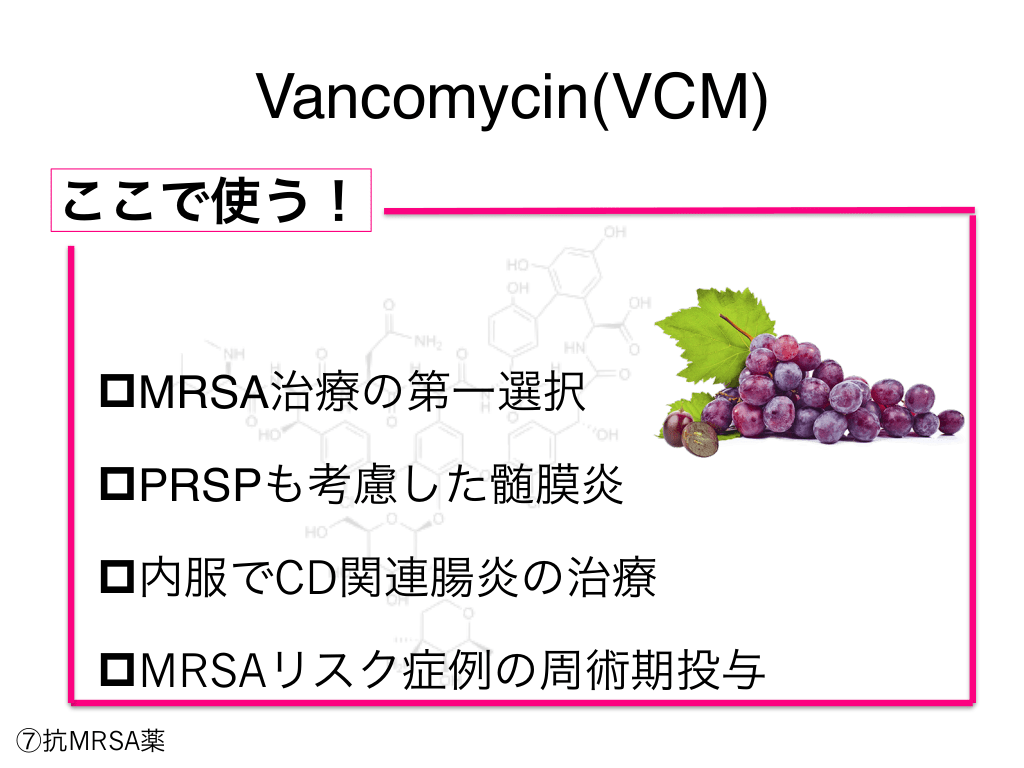 #88. Vancomycin(VCM) ここで使う! pMRSA治療の第一選択 pPRSPも考慮した髄膜炎 p内服でCD関連腸炎の治療 pMRSAリスク症例の周術期投与 ⑦抗MRSA薬