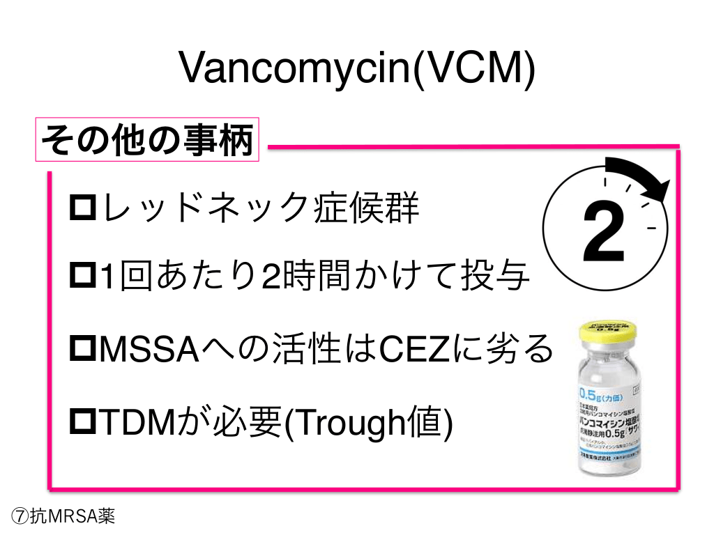 #90. Vancomycin(VCM) その他の事柄 pレッドネック症候群 p1回あたり2時間かけて投与 pMSSAへの活性はCEZに劣る pTDMが必要(Trough値) ⑦抗MRSA薬