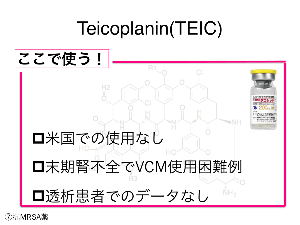 #91. Teicoplanin(TEIC) ここで使う! p米国での使用なし p末期腎不全でVCM使用困難例 p透析患者でのデータなし ⑦抗MRSA薬
