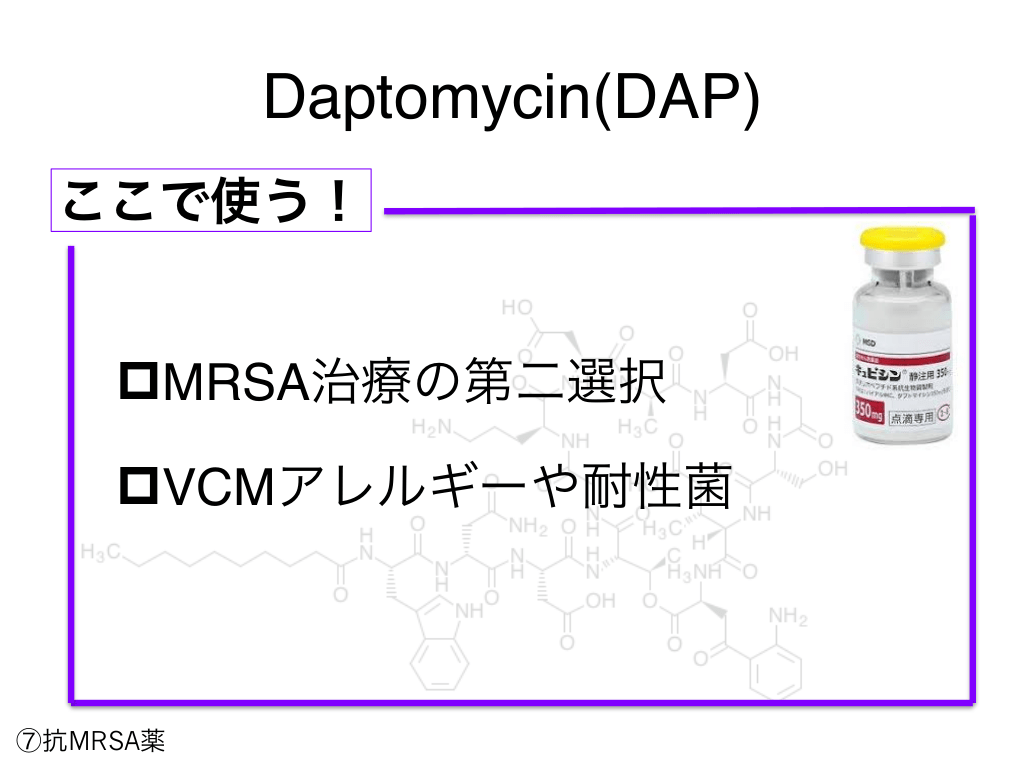 #92. Daptomycin(DAP) ここで使う! pMRSA治療の第二選択 pVCMアレルギーや耐性菌 ⑦抗MRSA薬