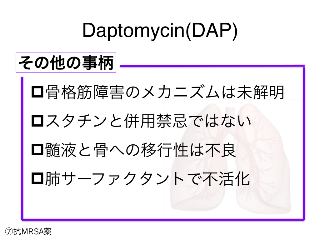 #93. Daptomycin(DAP) その他の事柄 p骨格筋障害のメカニズムは未解明 pスタチンと併用禁忌ではない p髄液と骨への移行性は不良 p肺サーファクタントで不活化 ⑦抗MRSA薬