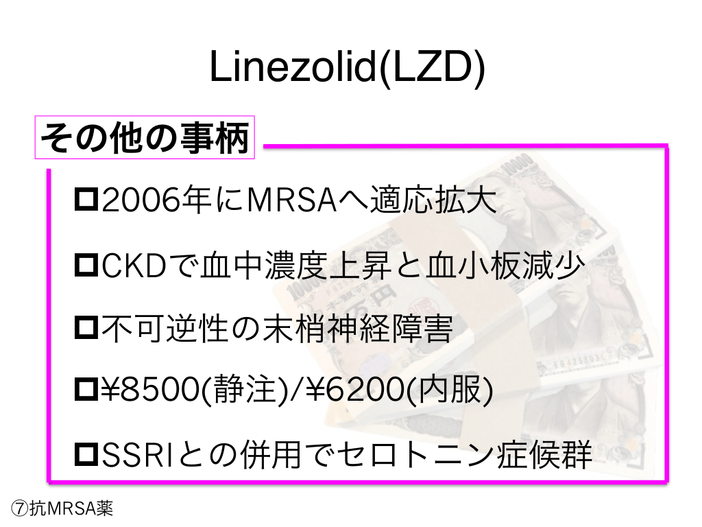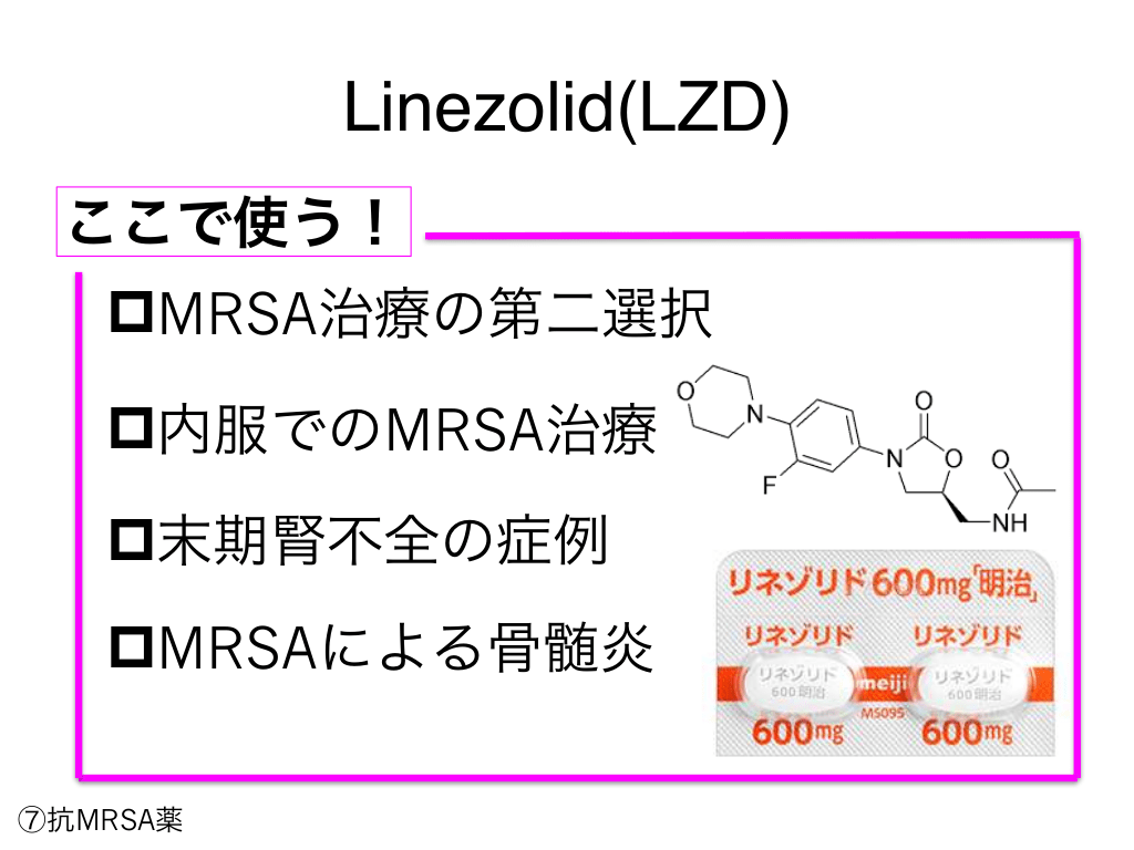 #94. Linezolid(LZD) ここで使う! pMRSA治療の第二選択 p内服でのMRSA治療 p末期腎不全の症例 pMRSAによる骨髄炎 ⑦抗MRSA薬