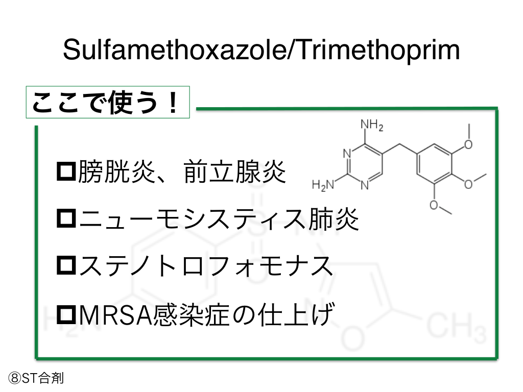 #98. Sulfamethoxazole/Trimethoprim ここで使う! p膀胱炎、前立腺炎 pニューモシスティス肺炎 pステノトロフォモナス pMRSA感染症の仕上げ ⑧ST合剤