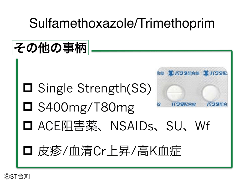 #99. Sulfamethoxazole/Trimethoprim その他の事柄 p Single Strength(SS) p S400mg/T80mg p ACE阻害薬、NSAIDs、SU、Wf p 皮疹/血清Cr上昇/高K血症 ⑧ST合剤
