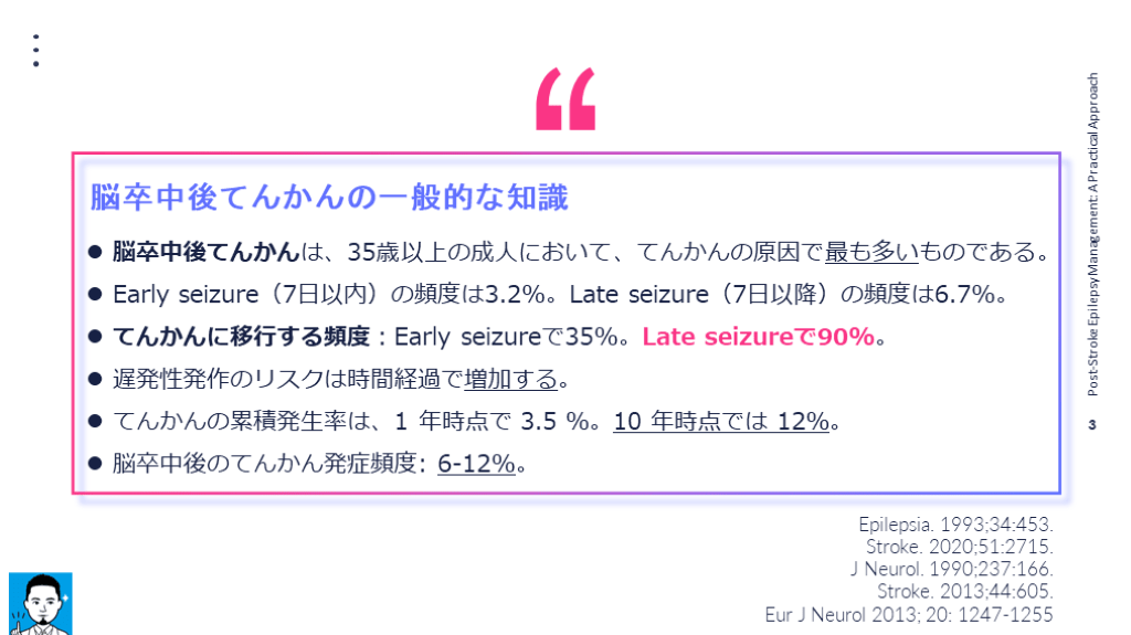 #3. 脳卒中後てんかんの一般的な知識 脳卒中後てんかんは、35歳以上の成人において、てんかんの原因で最も多いものである。