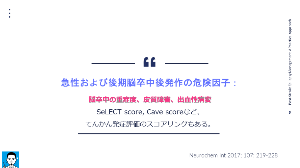 てんかん発症評価のスコアリングもある。 急性および後期脳卒中後発作の危険因子: Neurochem Int 2017; 107: 219-228