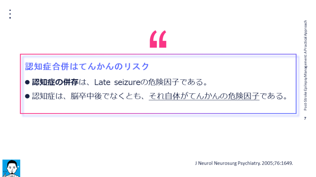 #7. 認知症合併はてんかんのリスク 認知症の併存は、Late seizureの危険因子である。