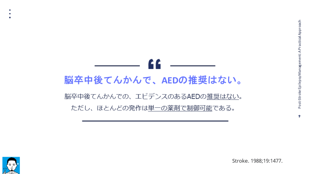 #9. 脳卒中後てんかんで、AEDの推奨はない。 脳卒中後てんかんでの、エビデンスのあるAEDの推奨はない。