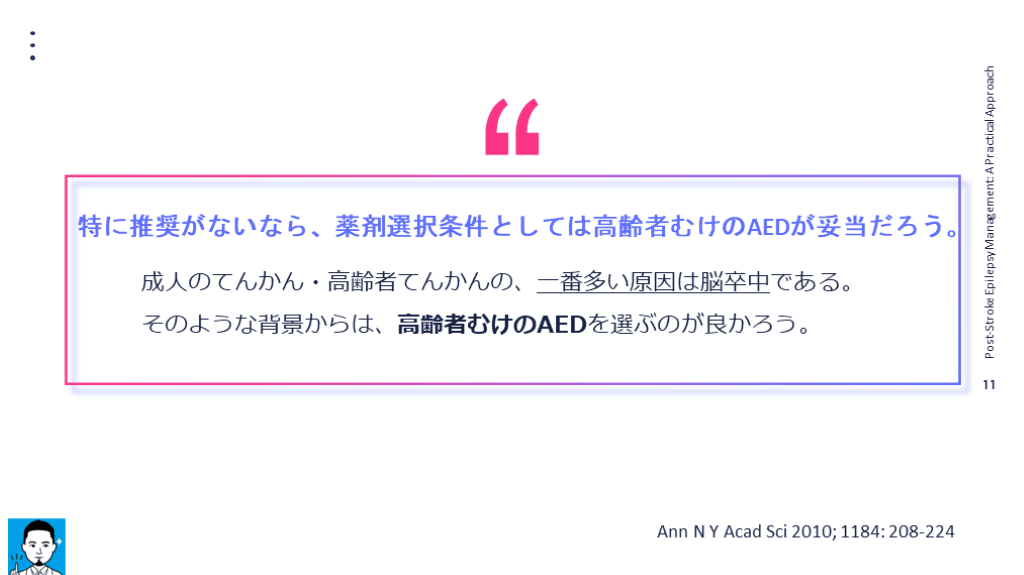 #11. 特に推奨がないなら、薬剤選択条件としては高齢者むけのAEDが妥当だろう。 成人のてんかん・高齢者てんかんの、一番多い原因は脳卒中である。