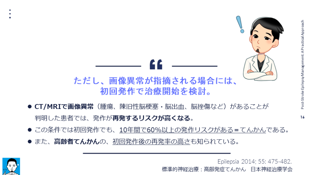 また、高齢者てんかんの、初回発作後の再発率の高さも知られている。 Epilepsia 2014; 55: 475-482. 標準的神経治療:高齢発症てんかん 日本神経治療学会