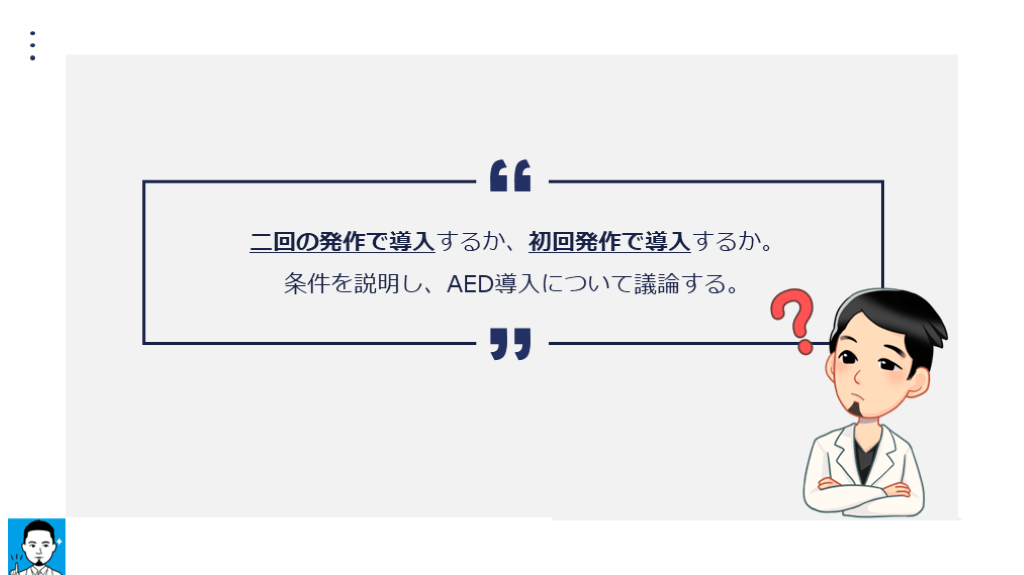 AEDごとの有している特徴をもとに、選択肢を議論する。 SUMMARY