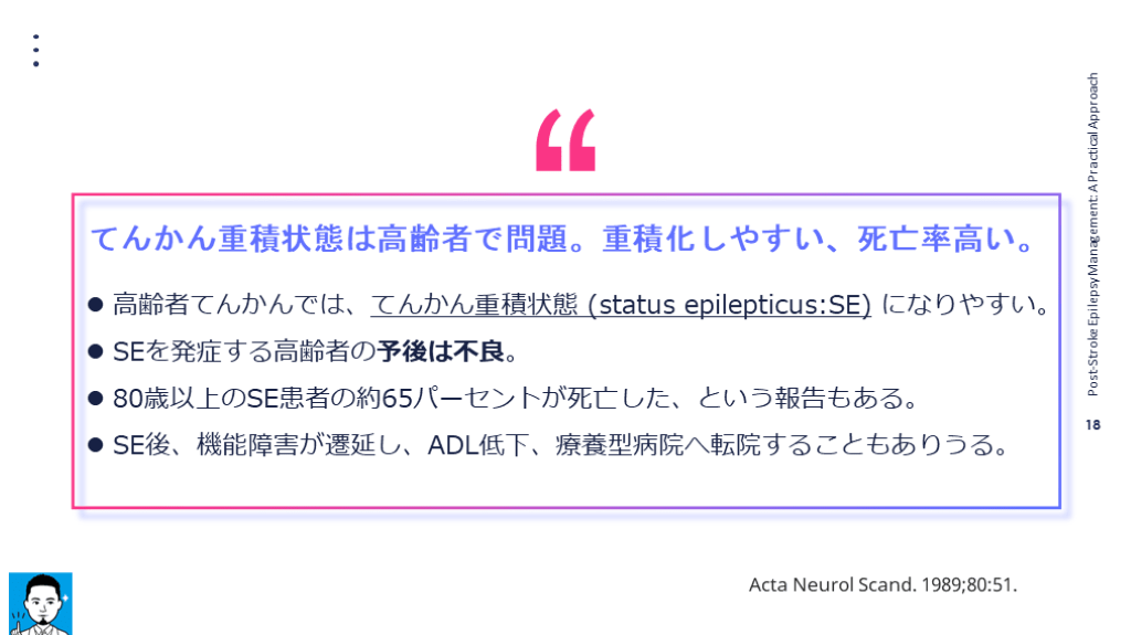 #18. てんかん重積状態は高齢者で問題。重積化しやすい、死亡率高い。 高齢者てんかんでは、てんかん重積状態 (status epilepticus:SE) になりやすい。